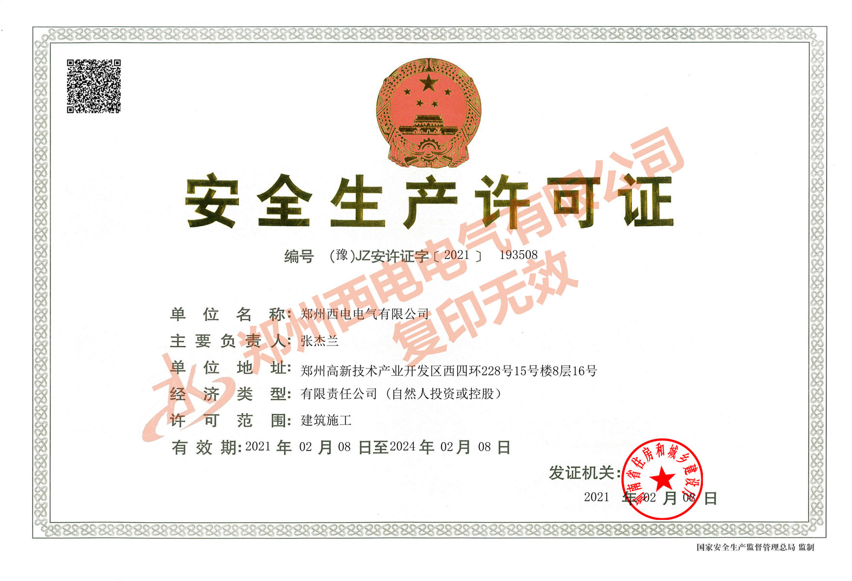 • 熱烈慶祝我公司申請(qǐng)的安全生產(chǎn)許可證正式公布。 注:加蓋公章有效 安全生產(chǎn)許可證是礦山企業(yè)、建筑施工企業(yè)和危險(xiǎn)化學(xué)品、煙花爆竹、民用爆炸物品生產(chǎn)企業(yè)必備的一..